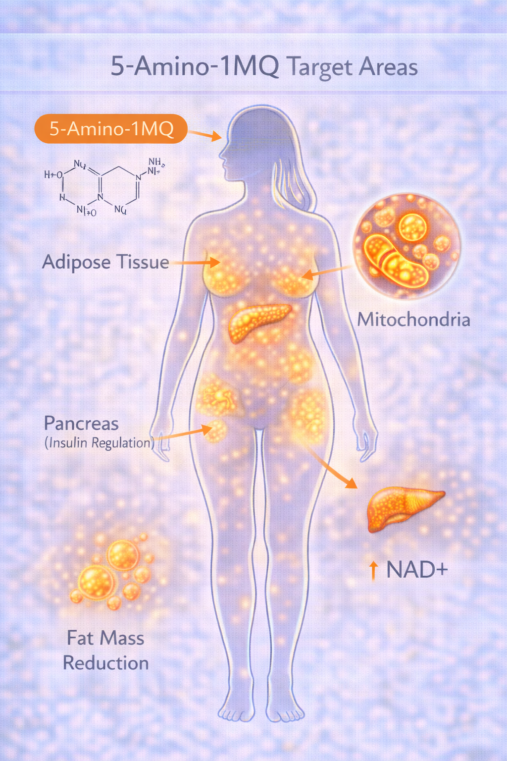 By blocking NNMT, 5-Amino-1MQ preserves NAD+ levels (critical for cellular energy production) and SAM (needed for methylation reactions). This shifts cellular metabolism toward fat oxidation and away from fat storage, particularly in adipose tissue.