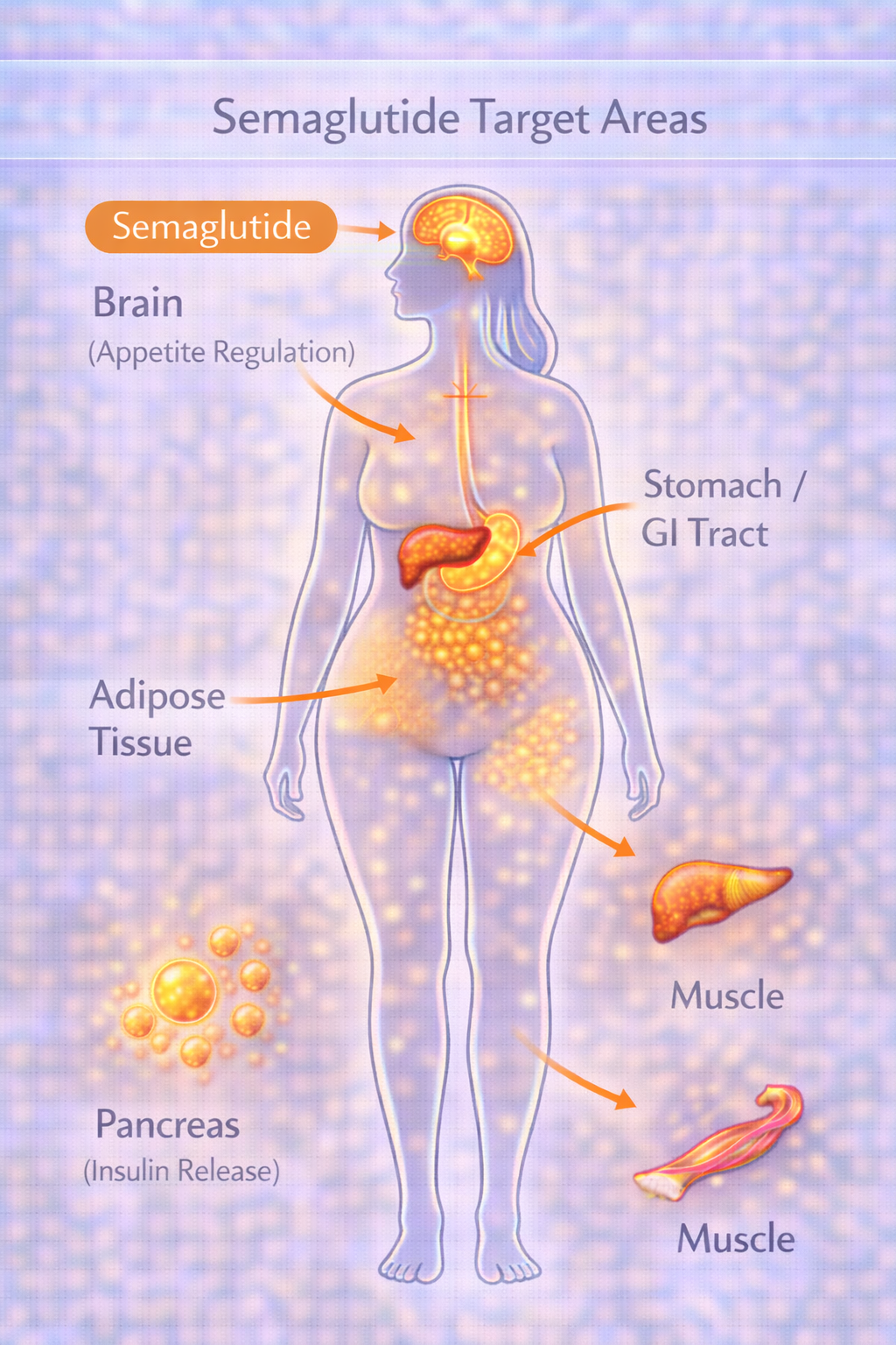 Semaglutide mimics the incretin hormone GLP-1, binding receptors in the pancreas (insulin release), brain (appetite suppression), and gut (gastric emptying). Unlike natural GLP-1 which lasts minutes, semaglutide's modifications extend its half-life to ~7 days.