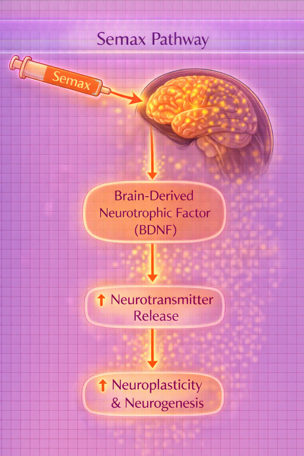 Semax is a synthetic fragment of ACTH (adrenocorticotropic hormone) that stimulates Brain-Derived Neurotrophic Factor (BDNF) production. BDNF is the brain's primary "growth factor" for neurons — supporting learning, memory, and cognitive function.