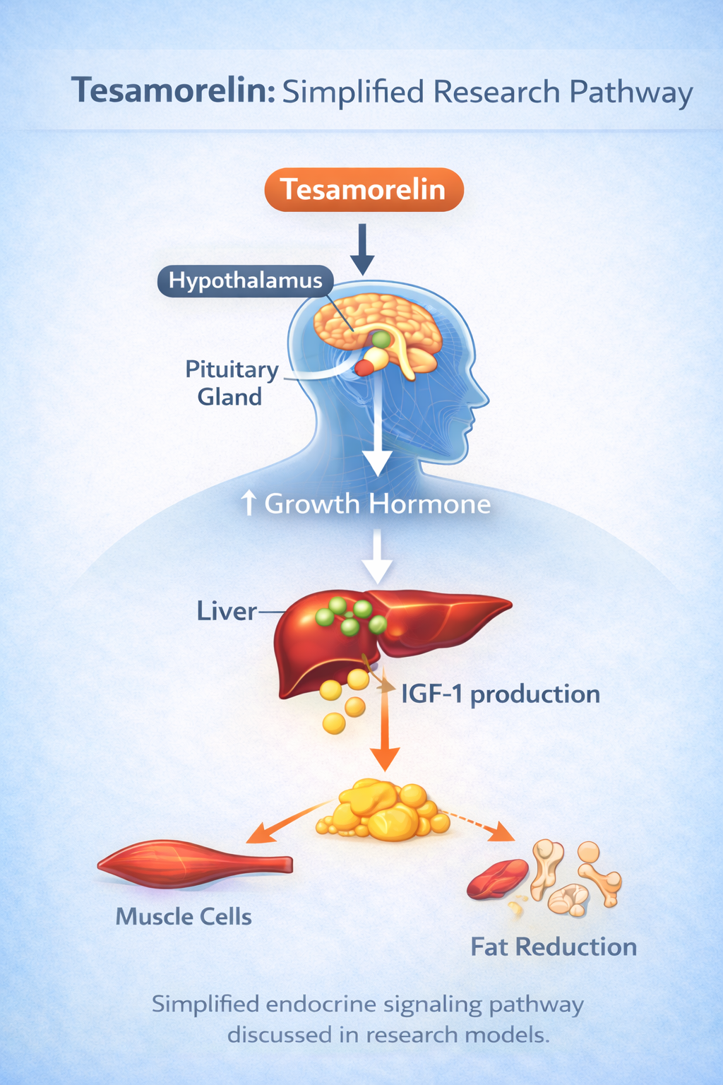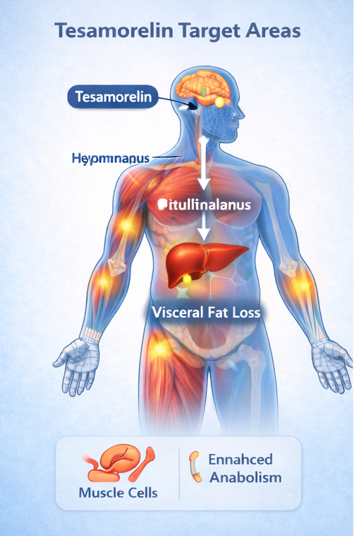 Growth hormone preferentially mobilizes visceral fat (deep abdominal fat around organs) over subcutaneous fat (fat under the skin). Tesamorelin's ability to increase GH levels results in selective reduction of this metabolically dangerous fat. Visceral fat is linked to insulin resistance, cardiovascular disease, and metabolic syndrome.