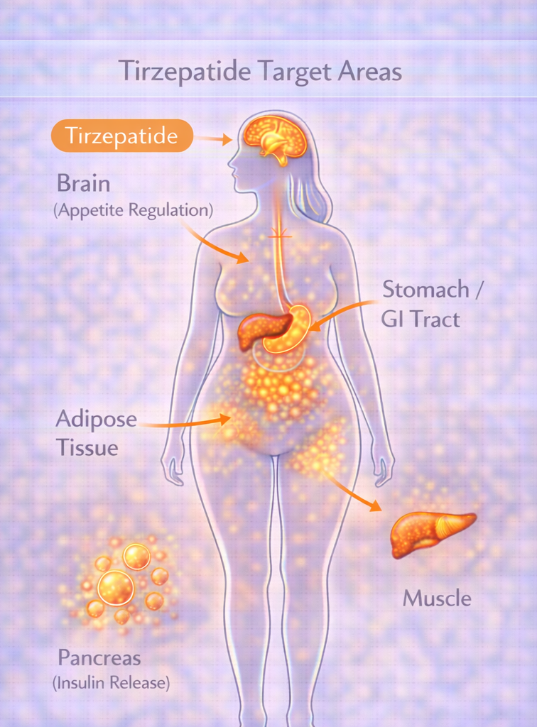 GLP-1 receptor activation drives appetite suppression and insulin secretion. GIP receptor activation enhances fat metabolism and may improve beta cell function. The dual signal produces a metabolic effect greater than the sum of its parts.